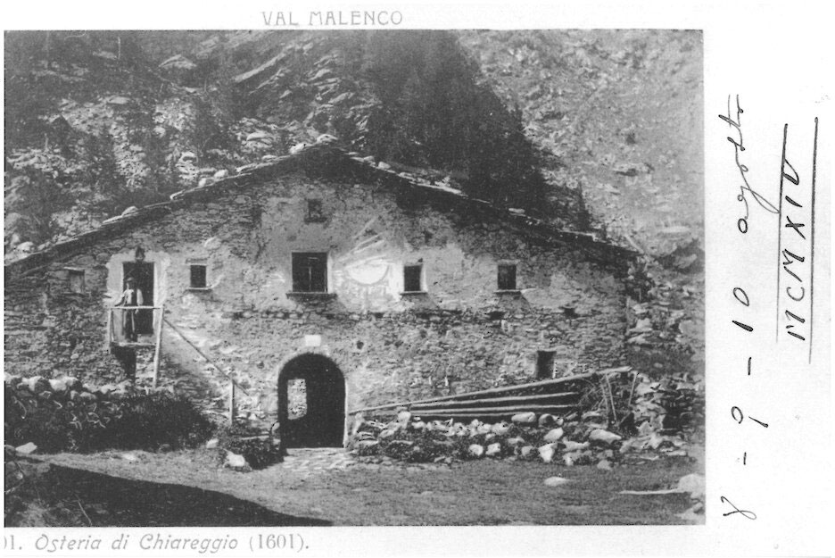 L’osteria di Chiareggio, attiva fin dal Medioevo, sorgeva lungo la storica via del Muretto, antica strada cavallera che collegava Sondrio all’Engadina. Situata a 1612 metri di quota, in località “Chiareggio” — un tempo nota anche come località Bosco — l’osteria fungeva da ospizio alpino per viandanti e animali da soma. Era una tappa obbligata lungo l’impegnativo itinerario alpino, essenziale per rifocillarsi o attendere condizioni meteorologiche favorevoli prima di affrontare l’ascesa al valico del Muretto. I principali frequentatori erano i mercanti grigioni, che attraversavano la valle dopo aver acquistato in Valtellina prodotti locali come vino, grano, castagne, tessuti, piode, utensili in pietra ollare, formaggi e bestiame. Già citata in un atto del 1537, l’osteria era dotata di un ampio stallazzo per il ricovero degli animali da soma e dei carri. L’edificio attuale, costruito in pietra locale e datato 1665, conserva ancora oggi elementi architettonici originari, come la tróna, un corridoio voltato che collegava magazzini, stalle e alloggi. È possibile che la prima osteria fosse situata nei pressi di quella seicentesca visibile ancora oggi, nella piazzetta centrale del paese, e che quest'ultima fosse una ristrutturazione o ricostruzione della struttura preesistente. Alcune fonti affermano però che l’osteria più antica si trovasse presso la Cuurt, la “Corte”, località a nord-est di Chiareggio, appena oltre il torrente Nevasco per chi proveniva da Sondrio.